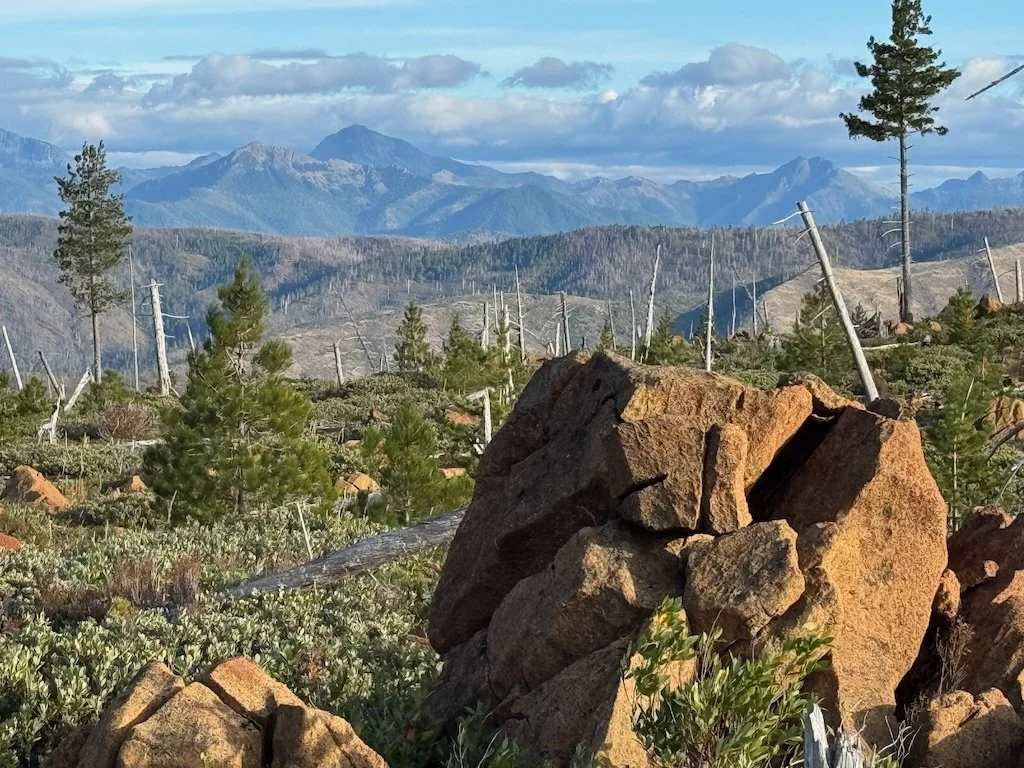 Looking north from Cleopatra Mountain, one has an uninterrupted view of the south rim of the Kalmiopsis Wilderness. From here, one can see Vulcan Peak, Chetco Peak & Red Mountain. Photo credit: Tim Palmer